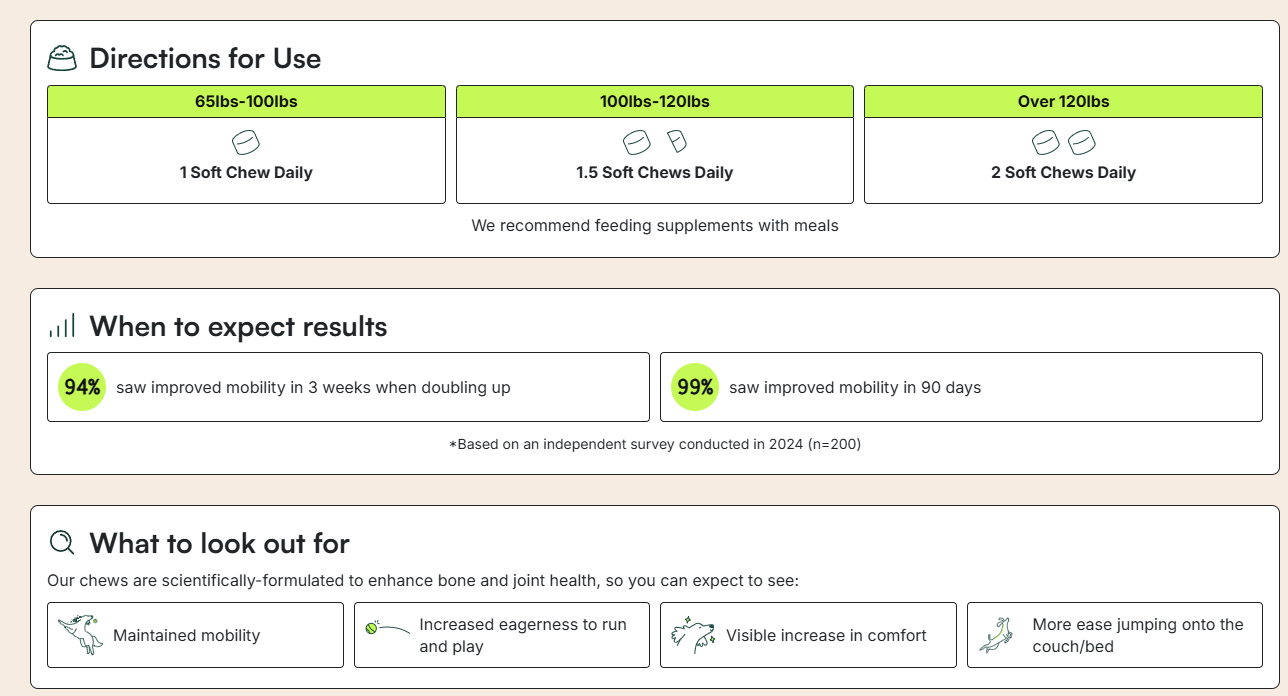 The Truth:Our joint supplements are an important part of a holistic approach to your dog’s well-being, but they're not a magic fix! Regular exercise and a balanced diet are key to maintaining joint health and overall vitality. Think of our supplements as the boost your dog’s joints need to stay happy and active.