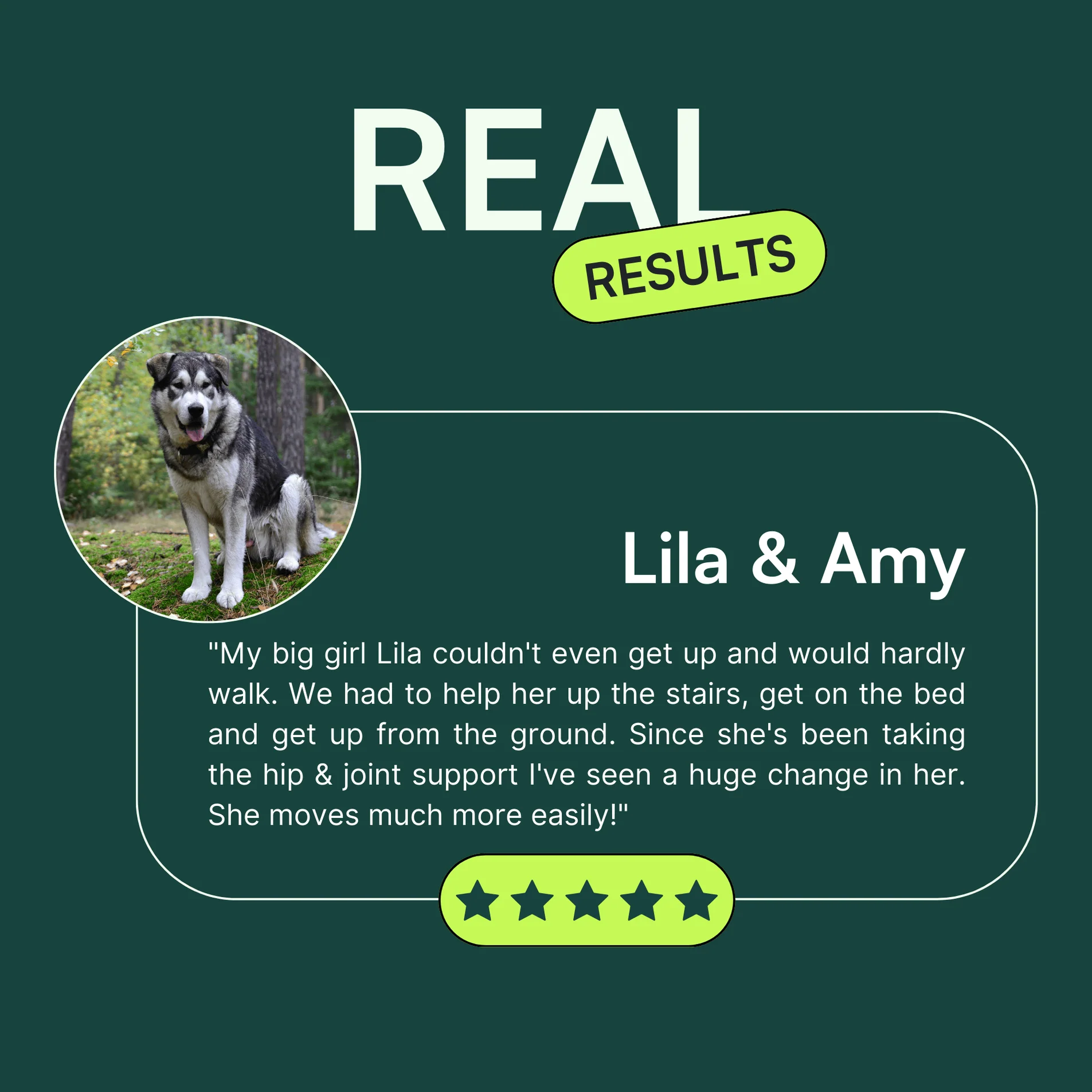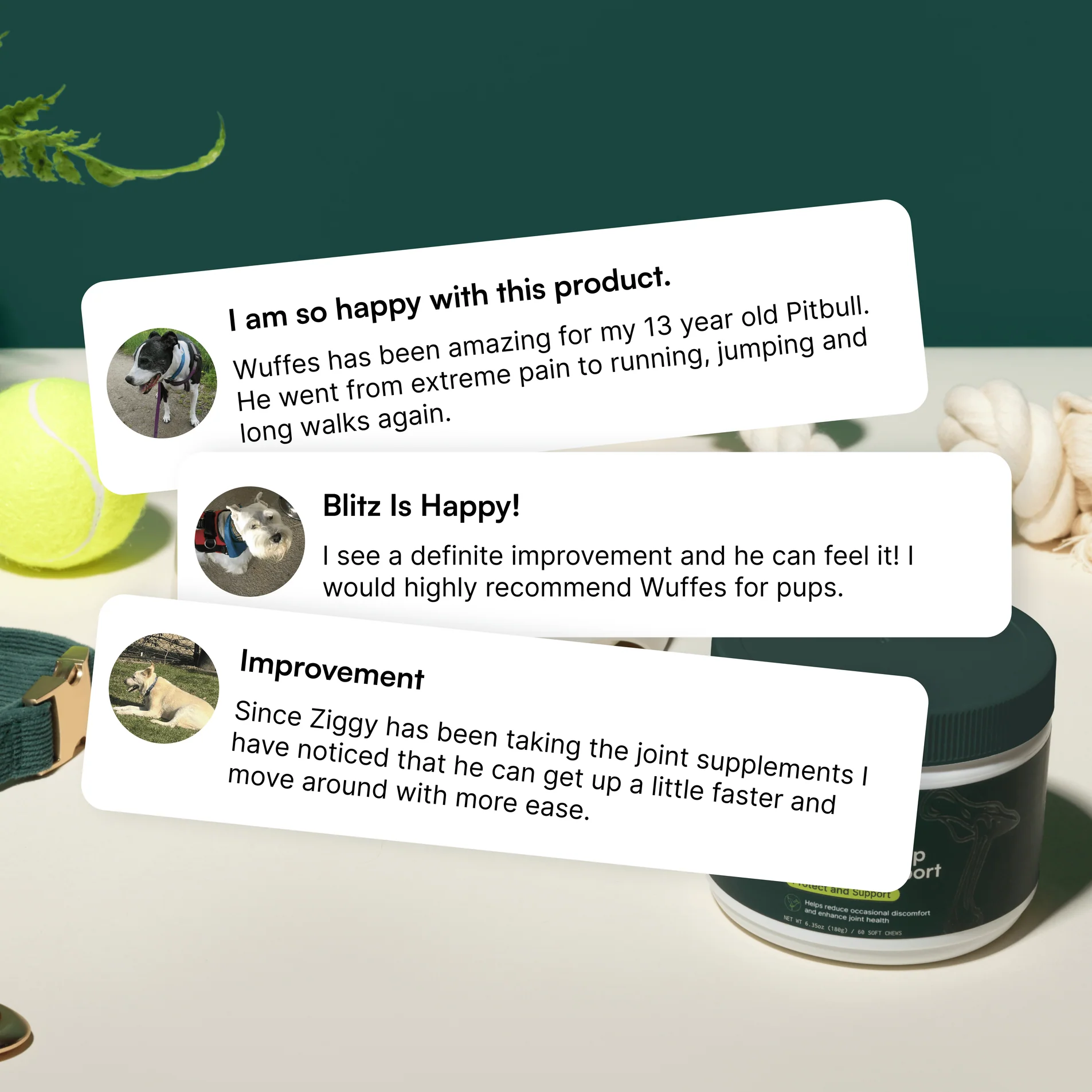 The Truth:Our joint supplements are an important part of a holistic approach to your dog’s well-being, but they're not a magic fix! Regular exercise and a balanced diet are key to maintaining joint health and overall vitality. Think of our supplements as the boost your dog’s joints need to stay happy and active.